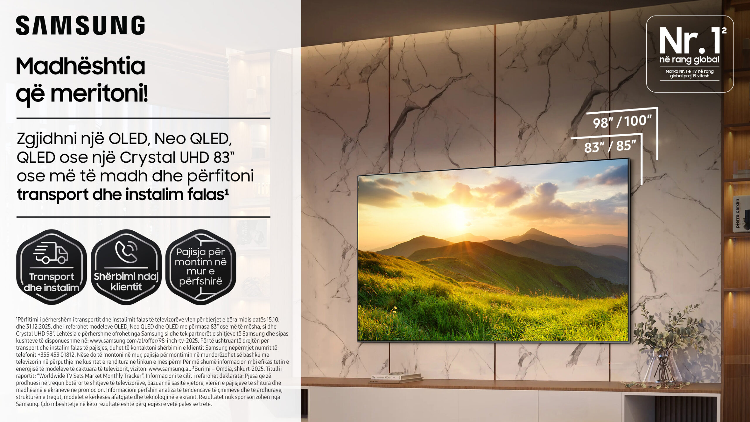 Zgjidhni një televizor Samsung OLED, Neo QLED ose QLED 210 cm (83’’) apo më të madh, ose Crystal UHD 249 cm dhe shijoni transport dhe instalim falas. Ekrani i madh 210 cm (83’’) ju ofron në një përvojë shikimi më intensive dhe mahnitëse të filmave, sportit dhe lojërave tuaja të preferuara. Çdo detaj duket më realist, çdo skenë më e gjallë, gjithçka që shihni bëhet një përvojë e re dhe emocionuese. Ju duhet vetëm të rehatoheni, ndërsa Samsung kujdeset për transportin dhe instalimin falas. Për më shumë detaje mbi promocionin, klikoni këtu.